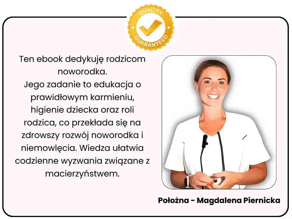 Często się zdarza, że po wyjściu ze szpitala zostajesz z dzieckiem sama. Bez instrukcji obsługi. Bez dostępu do wielu specjalistów. Chciałam to zmienić. Dlatego stworzyłam ten ebook w którym omawiam krok po kroku postępowanie z noworodkiem.